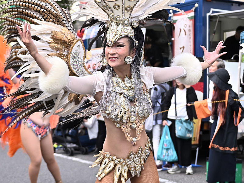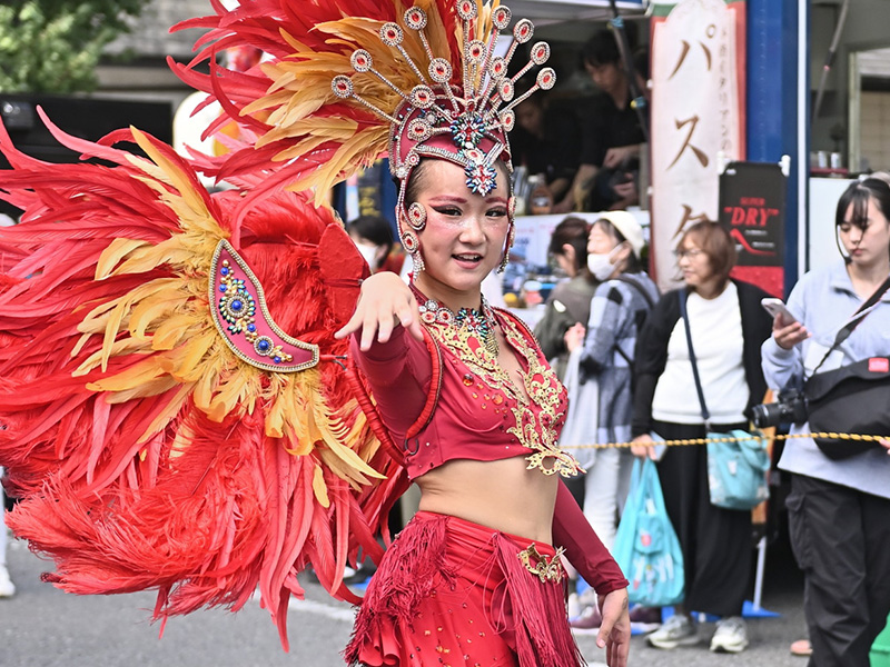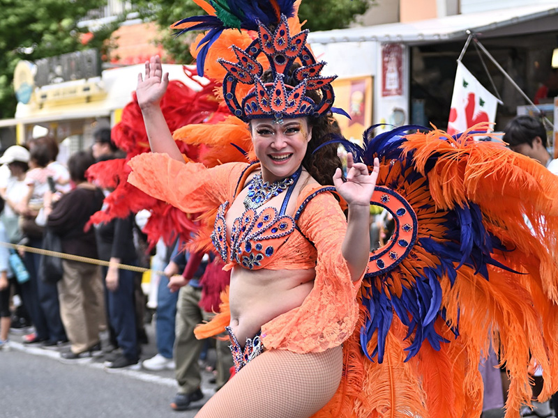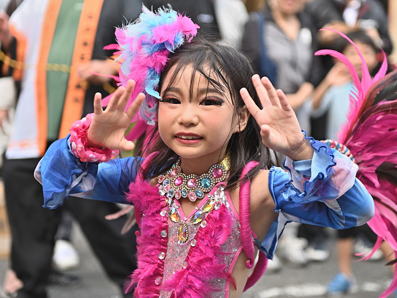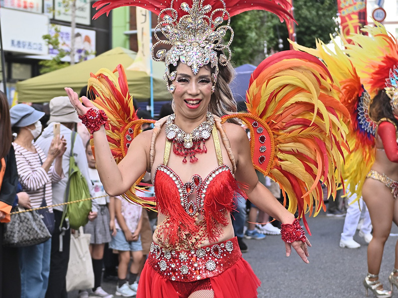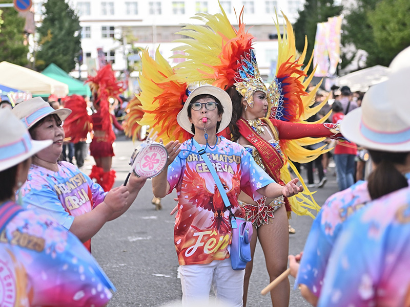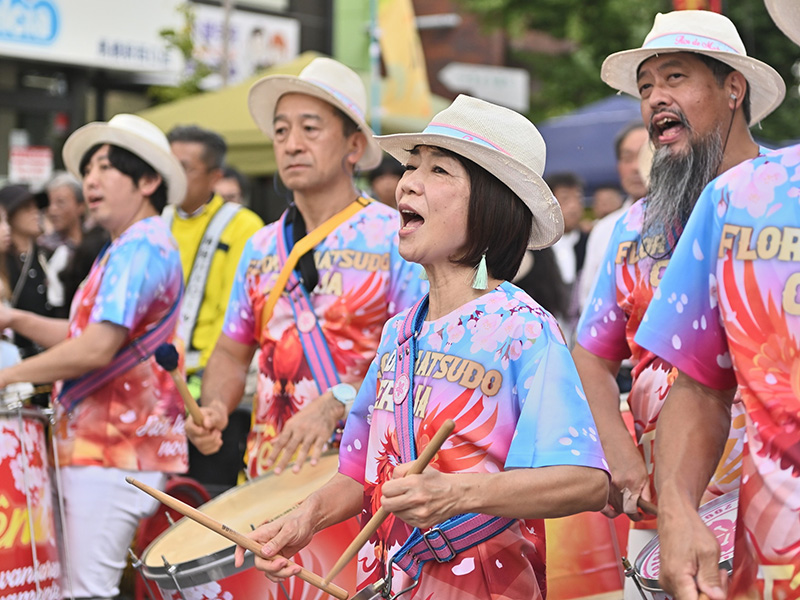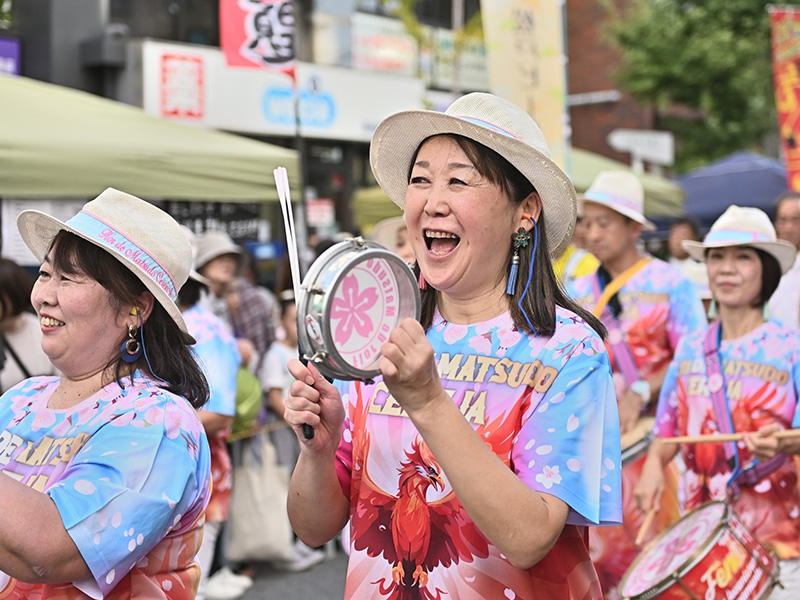 私たちも松戸代表のサンバチームとしてお祭りに参加させていただいています。出番後の冷たいビールをグビっと飲み干すイメージが脳裏を邪魔しにきますが、いまはお預け。気を引き締め、衣装や楽器を整え、レッドカーペットが引かれた駅前ステージにスタンバイ。タカラカと太鼓が鳴り響き、いよいよ本番スタートです。トップダンサーのソロに続き、ダンサー全9名が打楽器隊14名とともにステージに揃い、そのまま歩行者天国をパレードしてゆきます。笑顔、笑顔、また笑顔。あなたも、わたしも、ワンちゃんも。沿道からヌーっと伸びてくるお婆ちゃんの手を握れば、意外なほど強く握りかえされ、元気パワーありがとう!お互い長生きして頑張ろうね! ちいちゃな子供達のキラキラした笑顔も印象的。松戸市で元気に楽しく育ってね!サンバ習いたくなったらセレージャはいつでも君の入会をまってるよ。
