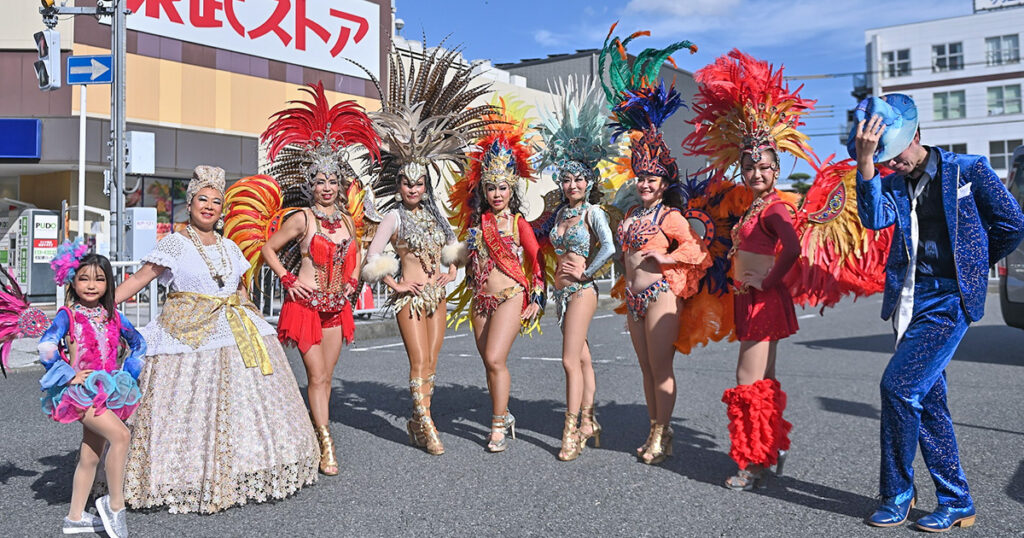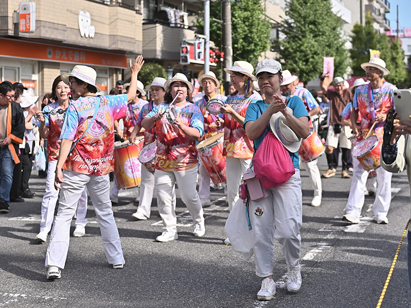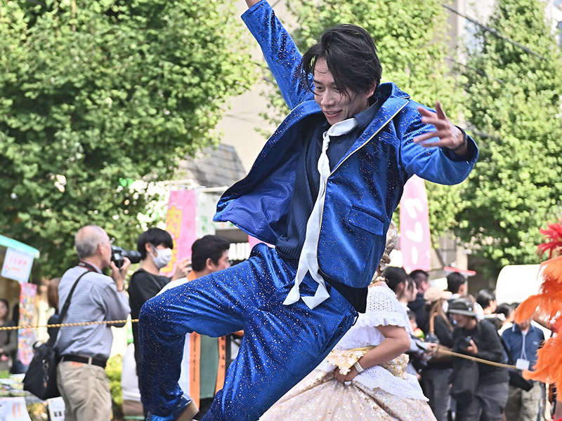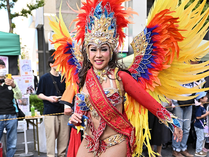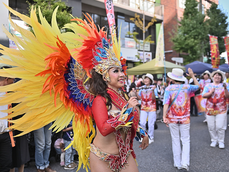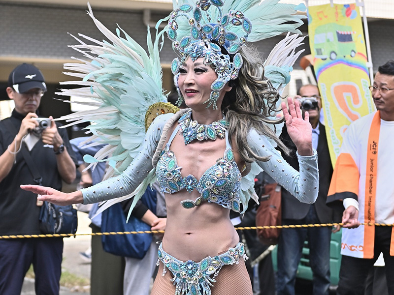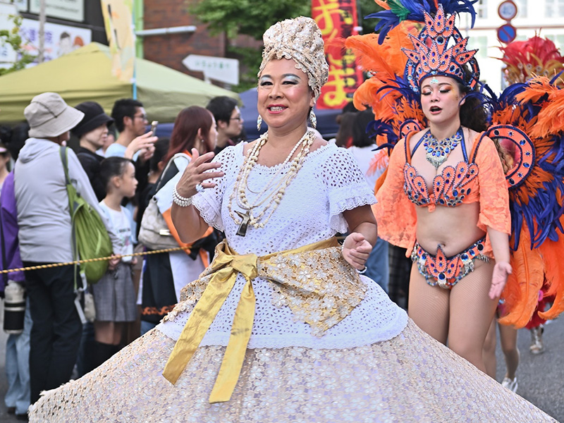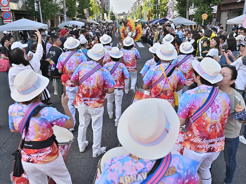 私たちも松戸代表のサンバチームとしてお祭りに参加させていただいています。出番後の冷たいビールをグビっと飲み干すイメージが脳裏を邪魔しにきますが、いまはお預け。気を引き締め、衣装や楽器を整え、レッドカーペットが引かれた駅前ステージにスタンバイ。タカラカと太鼓が鳴り響き、いよいよ本番スタートです。トップダンサーのソロに続き、ダンサー全9名が打楽器隊14名とともにステージに揃い、そのまま歩行者天国をパレードしてゆきます。笑顔、笑顔、また笑顔。あなたも、わたしも、ワンちゃんも。沿道からヌーっと伸びてくるお婆ちゃんの手を握れば、意外なほど強く握りかえされ、元気パワーありがとう!お互い長生きして頑張ろうね! ちいちゃな子供達のキラキラした笑顔も印象的。松戸市で元気に楽しく育ってね!サンバ習いたくなったらセレージャはいつでも君の入会をまってるよ。